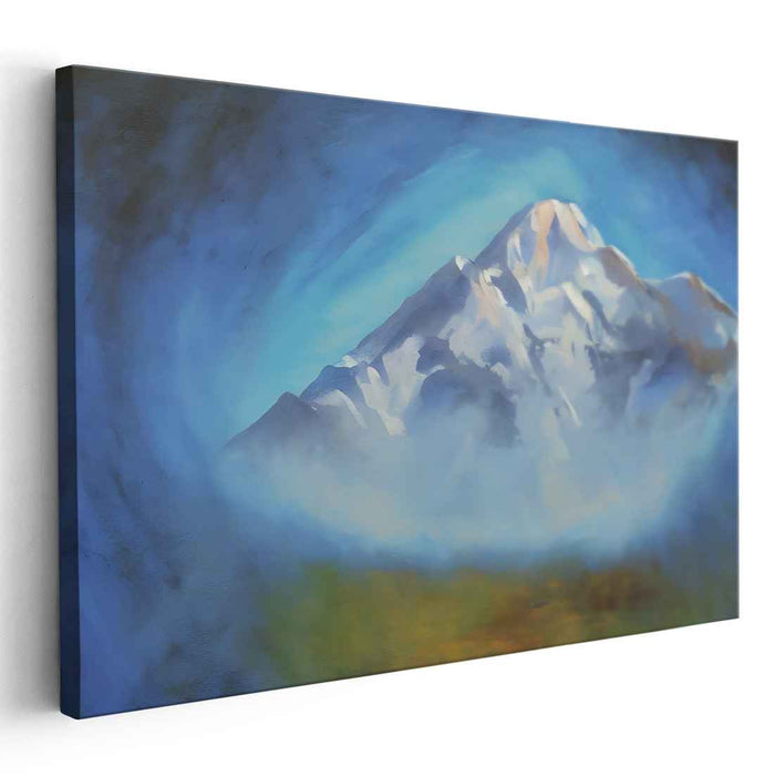The artist skillfully employs a gradient of blues, ranging from deep, opulent shades at the peripheries to softer, more peaceful tones near the summit, crafting a profound sense of depth and serenity. The snow adorning the mountain sparkles with delicate hints of white and gentle pastels, juxtaposed harmoniously against the darker, shaded regions. The foreground blends earthy greens and browns, hinting at a verdant landscape that dissolves into the mist, adding to the ethereal ambiance of the piece.