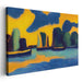 Introducing "Tranquil Sails: Bold Impressionist Lakeside Canvas Art Print," a captivating artwork that transports viewers to a serene lakeside setting where sailboats glide gently across the water, enveloped in a symphony of bold and contrasting colors. This vivid piece is dominated by a vibrant yellow hue, symbolizing the sky and its reflection on the water, while deep blues and greens depict the tranquil waters and lush surrounding trees, creating a harmonious and balanced color palette.
