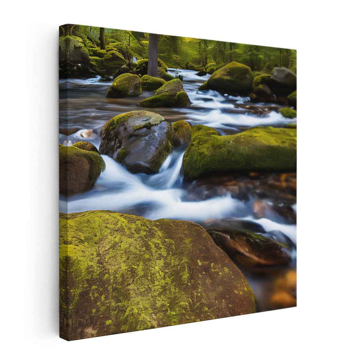 Emanating a sense of calm and tranquility, the soft, flowing lines of the river instill a feeling of peacefulness, while the verdant moss adds a touch of vitality to the scene. Ideal for spaces that prioritize relaxation and connection with nature, this artwork is a perfect fit for a living room, bedroom, or office, infusing the indoors with the soothing presence of a serene forest stream.