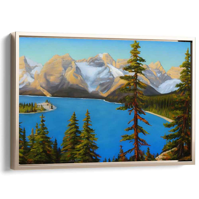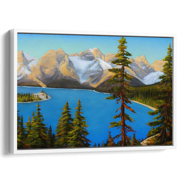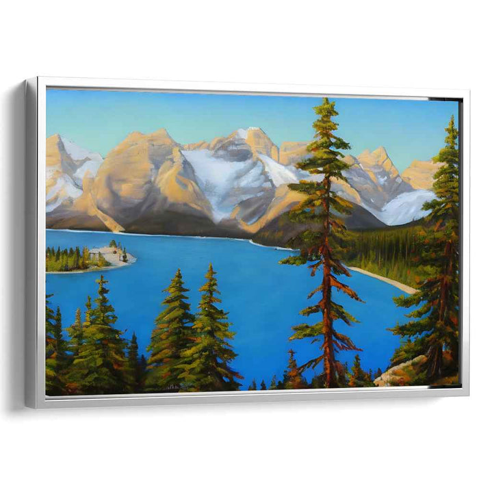 Introducing "Tranquil Waterscape Escape," a breathtaking landscape canvas art that immerses viewers in the serene beauty of a mountain lake nestled among towering pine trees and majestic snow-capped peaks. This captivating artwork captures the essence of tranquil nature, with the clear blue waters of the lake mirroring the azure sky above.