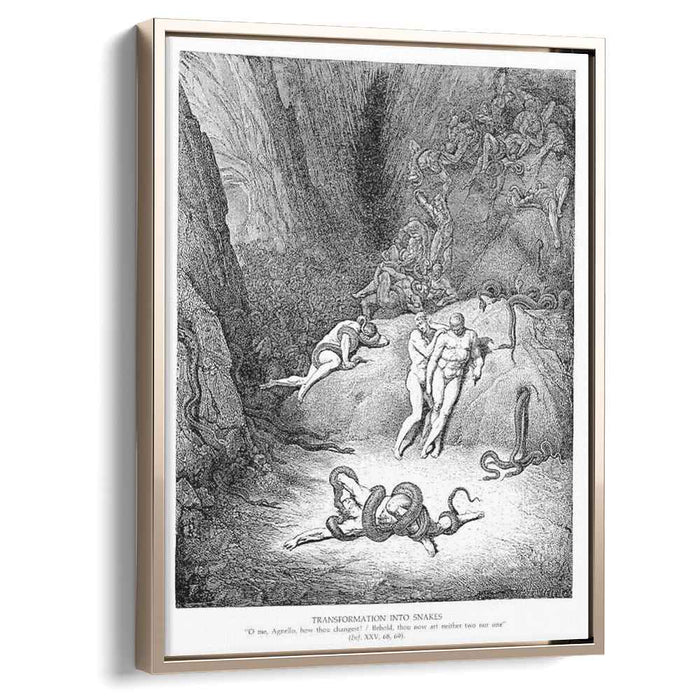 Step into the enigmatic world of Gustave Doré's "Transformation into Snakes," a captivating masterpiece that transports viewers into the heart of a mythical tale. This striking artwork, crafted in 1870, now graces high-quality canvas, inviting you to delve into its depths and unravel its intricate layers of meaning.