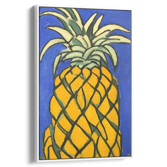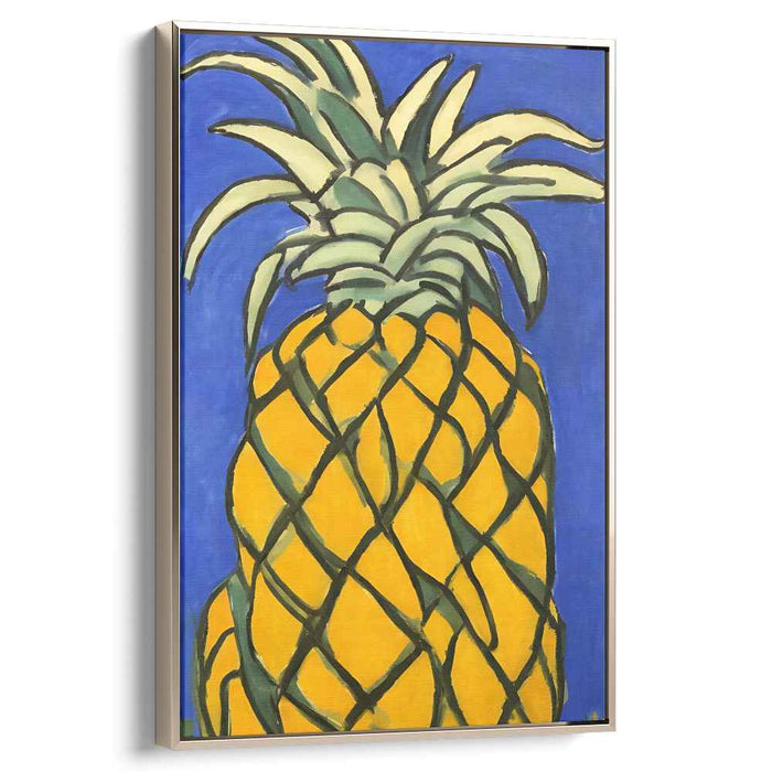 The pineapple, portrayed with rich yellow tones, a textured surface, and a spiky green crown, is a mesmerizing blend of realism and artistic interpretation. The use of bold, saturated colors and clean, powerful lines infuses this piece with a contemporary yet enduring charm.
