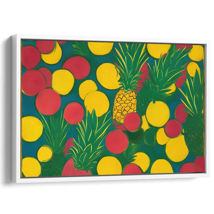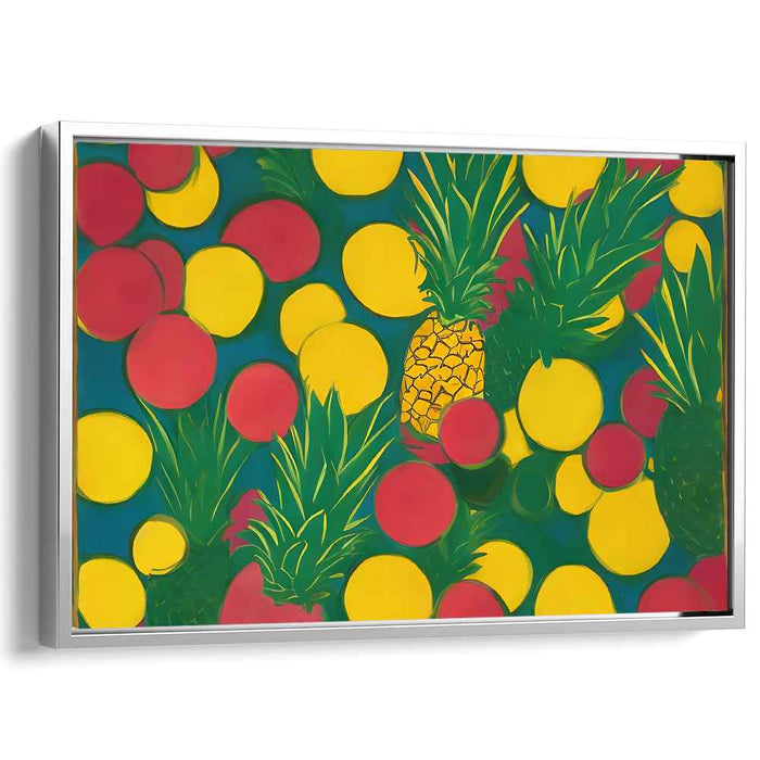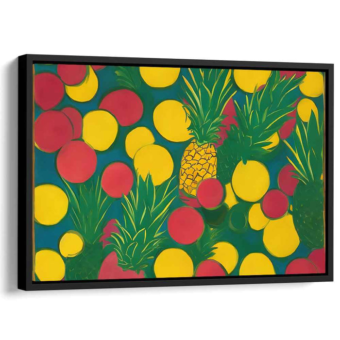 Immerse yourself in the lively and vibrant world of "Tropical Fruit Fiesta," a captivating still life canvas art that celebrates the exuberance of nature through a dynamic composition of pineapples and assorted circular fruits, possibly peaches or apples. This artwork is a delightful feast for the eyes, boasting a primary color palette of bold yellows and reds, harmoniously complemented by lush green foliage against a deep teal background.