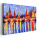 In this piece, bold reds and oranges dominate the cityscape, vividly contrasting with the cool blues and purples of the evening sky. The artist's use of a thick impasto technique, employing broad, expressive brushstrokes, adds a textured depth to the painting, reminiscent of the Post-Impressionist style akin to Vincent van Gogh and Claude Monet.