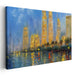 Introducing "Twilight Palette Whispers," a mesmerizing cityscape canvas art that captures the vibrant energy of an urban environment at dusk, where skyscrapers pierce the skyline, illuminated by the golden hues of the setting sun. The tranquil waters below mirror the towering buildings, creating a scene of serene beauty amidst the bustling city life.
