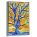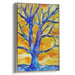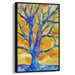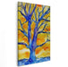 The tree stands out against a background of warm yellows, oranges, and hints of red, reminiscent of a breathtaking sunset or an autumn sky. The interplay of cool blues and purples with warm hues creates a dynamic and harmonious balance, infusing the piece with depth and dimension.
