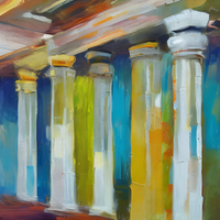 The artwork features a series of classical columns depicted with a unique blend of realism and abstraction. Bold strokes of primary colors, primarily blue and yellow, take center stage, while secondary hues of green, white, and hints of orange add depth and complexity to the composition. The artist's use of thick and thin brushstrokes creates a textured and layered effect, inviting viewers to explore the piece's depth.