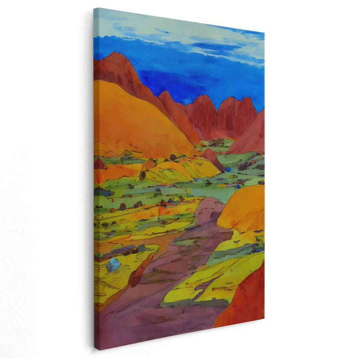 Introducing 'Whimsical Echoes Across Valleys: Vibrant Mountains and River Scene,' a captivating landscape canvas art that mesmerizes viewers with its vivid colors and dynamic composition, transporting them to a scene of awe-inspiring beauty and energy. This artwork showcases a grand vista of rolling hills and towering mountains, painted in bold shades of orange and red, creating a visual spectacle that commands attention.