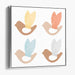 Embrace the essence of modern minimalism with this delightful illustration of stylized birds, each with its own unique feather color. Elevate your decor with a piece that scores high on aesthetic appeal, offering a pleasing color palette and a sense of balanced composition.
