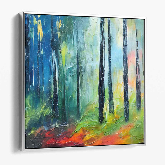 Introducing 'Whispering Forest Echo: Vibrant Woodland,' a mesmerizing canvas art print that transports viewers into a lush, vibrant forest setting, where majestic trees tower against a backdrop of rich, textured hues. This captivating artwork captures the essence of a dense woodland, enveloping you in a serene and tranquil ambiance.