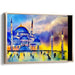 Introducing 'Whispers Of Dawn Over Minarets,' a mesmerizing watercolor canvas art showcasing a grand mosque, reminiscent of the iconic Blue Mosque of Istanbul, set against a dramatically illuminated sky. This artwork masterfully employs a vibrant palette dominated by deep blues and lively oranges, creating a captivating contrast that beautifully captures the essence of either a serene sunset or a glorious sunrise.
