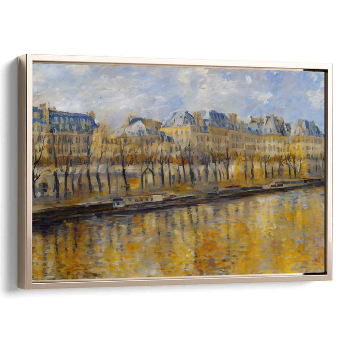 The primary color palette of rich golden yellow symbolizes the sun's reflection on the water, infusing the artwork with warmth and brightness. Soft blues and creamy whites delicately contrast the golden hues, adding depth and serenity to the composition, reminiscent of a tranquil Parisian afternoon.