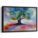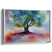 The tree stands out with delicate strokes, almost ethereal in its presentation, amidst a canopy of blues, greens, and yellows that blend harmoniously. The contrast between the soft, flowing colors above and the darker, more defined trunk and branches creates a mesmerizing visual impact. The ground below complements this with warm hues of reds, oranges, and pinks, offering a striking juxtaposition with the cool tones above.