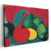 The fruits burst with vibrant, saturated colors against a deep, rich red background, creating a visually dynamic and stimulating piece. Complementing the primary hues are shades of green, yellow, purple, and blue, adding depth and complexity to the composition. Drawing inspiration from Fauvism, this artwork embraces bold, non-naturalistic colors and simplified forms, reminiscent of renowned artists like Henri Matisse and André Derain.