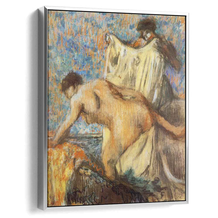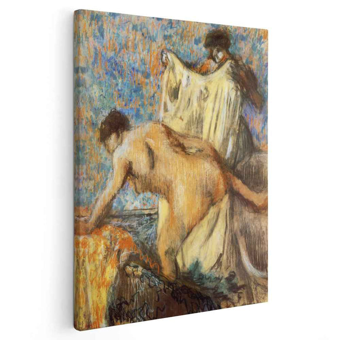 Introducing our stunning canvas print of the timeless masterpiece, Woman Leaving Her Bath, by the legendary French Impressionist artist, Edgar Degas. This captivating artwork depicts a woman wrapped in a white towel, leaving her bath and reaching for a robe. Degas' signature brushstrokes and use of pastel colours bring the scene to life, capturing the intimate moment with a sense of grace and elegance.