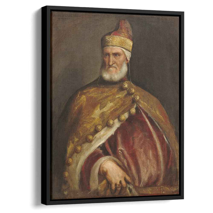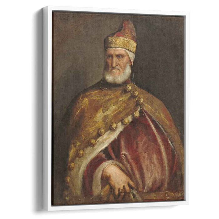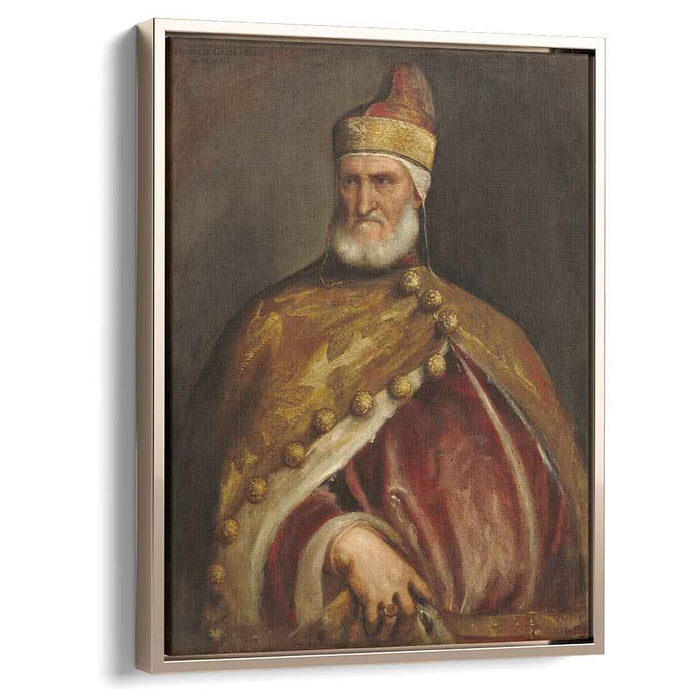 Unveil the captivating presence of Doge Andrea Gritti in Titian's iconic portrait, painted in 1545. This masterpiece, now available as a high-quality canvas print, invites you to witness the grandeur and subtle nuances of Venetian art.