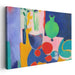 Introducing 'Abstracted Canvas,' an electrifying abstract expressionist canvas art print that pulsates with a riot of colors and forms, exuding a dynamic and lively energy that captivates the viewer's imagination. This masterpiece showcases a kaleidoscope of shapes and objects, from a bouquet of flowers in a vase to a vivid green jug, all set against a deep, velvety blue backdrop that enhances the piece's vibrancy.