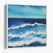 The upper portion of the artwork transitions from a profound oceanic blue to a lighter, almost ethereal sky blue, symbolizing the vast expanse of the sky meeting the water. Below, the waves come to life with varying shades of navy and azure, adorned with glistening white caps that seem kissed by sunlight. The fluidity of the watercolor technique enhances the illusion of movement, making the ocean depicted in the painting appear alive with a gentle, rhythmic motion.