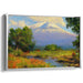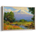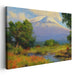 Introducing "Alpine Blossom Vista," an enchanting landscape canvas art that immerses viewers in a tranquil natural oasis dominated by a grand snow-capped mountain, reminiscent of the majestic allure of Mount Kilimanjaro. The artwork skillfully captures the peak's towering magnificence, with a pristine white summit that commands attention against the backdrop.