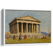 The artwork showcases a grand temple adorned with stately columns and a pediment, meticulously capturing the texture of the weathered stone structure. The temple is depicted in earthy tones of beige and brown, contrasting beautifully with the soft, pale blue sky. Figures dressed in vibrant red, orange, and blue garments populate the scene, adding a lively contrast to the overall muted palette.