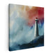 Introducing 'Aqua Beacon Drama,' an evocative canvas art piece that captures the timeless allure of a solitary lighthouse standing resilient against a tempestuous sky, blending vivid hues of blue, gray, and a striking dash of red to create a scene that is both dramatic and serene. The stark white lighthouse with bold red accents serves as a beacon of stability amidst the swirling chaos of the stormy backdrop.