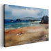 The primary color palette of this piece is a harmonious blend of soothing blues and earthy browns, seamlessly merging to evoke the serene ambiance of the coast. The foreground is awash with warm sandy tones, transitioning elegantly into the cool, deep blues of the ocean waves. Softly rendered distant hills add depth and a serene vastness to the scene, enhancing the overall feeling of calm and peace.