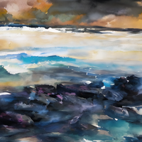 The color palette of this piece is a symphony of blues, ranging from deep navy to serene aqua tones, dominating the ocean and sky, while secondary colors like earthy browns and purples add depth to the rocky shore and stormy clouds. The sky above is a swirling mix of stormy clouds in dark gray, deep blue, and hints of burnt orange, hinting at an impending storm or its aftermath, adding a sense of foreboding to the composition.