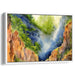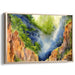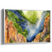 Introducing 'Aquarelle Serenity: Serene Watercolor Landscape Canvas Art Print,' a mesmerizing piece that immerses viewers in a tranquil, natural haven, evoking the essence of an untouched paradise. This captivating artwork depicts a lush, verdant forest cascading down rocky cliffs, converging into a misty valley below, enveloped in a serene atmosphere.