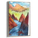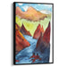 The mountains, cloaked in deep reds and burnt oranges, stand in majestic contrast against the soft, misty skies painted in hues of yellows and greens. The river, a focal point in rich blues, adds a dynamic flow to the composition, guiding the viewer's gaze through the scenic beauty of the artwork. The seamless blending of colors, facilitated by the watercolor medium, creates a dream-like quality that enhances the sense of depth and perspective within the piece.