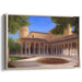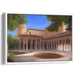 Introducing "Architectural Elegance Unveiled: Timeless Beauty of Moorish Architecture," a captivating canvas art piece that transports viewers to a serene and historic oasis, showcasing the exquisite beauty of an ancient courtyard inspired by Moorish architecture. This artwork bathes in natural sunlight, illuminating intricate arches, columns, and a reflective pool that mirrors the lush greenery.