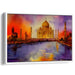 The primary colors of purples and oranges infuse the scene with a sense of grandeur and warmth, while hints of red, blue, and yellow add depth and vibrancy to the composition. The reflection of the Taj Mahal in the serene waters below enhances the symmetry and tranquility of the piece, elevating its visual impact.