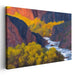 Introducing "Autumn River Valley: Serene Landscape Canvas Art," a mesmerizing painting that transports viewers to a tranquil river valley embraced by towering cliffs. The artwork captures a serene scene where a winding river, depicted in glistening shades of white and light blue, meanders through the landscape. Lush clusters of trees, ablaze in vibrant autumnal yellows and greens, adorn the riverbanks, while majestic cliffs painted in rich red and brown hues stand tall on either side, creating a striking contrast with the verdant surroundings.