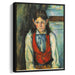 The subject of the painting, a young boy dressed in a vibrant red vest, invites contemplation. The boy's direct gaze and expressive eyes draw the viewer into his world, revealing a sense of vulnerability and quiet introspection. Cézanne's portrayal of childhood captures the innocence, curiosity, and boundless potential of youth.