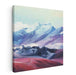 The focal point of this piece is the grand mountain range, skillfully depicted in cool blues and purples, giving the impression of towering peaks enveloped in mist and snow. Contrasting this majestic backdrop, the foreground features vibrant red and pink hues, creating a dramatic and visually striking terrain. The sky above transitions from a soft pastel blue to a gentle yellow, infusing the scene with a calming and expansive atmosphere.