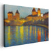 Introducing 'Brushstrokes Of Urban Reflections,' a mesmerizing canvas art that transports viewers to a historic cityscape at twilight, enveloped in serene enchantment. This captivating artwork captures the play of softly glowing lights dancing on the tranquil river waters, painting a scene brimming with warmth and tranquility.