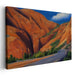 Step into the mesmerizing world of 'Canvas Mirage: A Vivid Landscape Portrait,' a captivating canvas art piece that transports you to the heart of a breathtaking canyon landscape, illuminated by the golden rays of the sun. This striking artwork showcases a meandering road that guides the viewer through the rugged grandeur of the canyon, enveloped by towering red rock formations adorned with subtle touches of green foliage that break the monotony of the fiery reds.