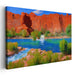 Immerse yourself in the serene beauty of 'Canyon Tranquility: A Vibrant Landscape Canvas Art'. This captivating artwork transports viewers to a lush river scene, nestled within towering red canyon walls under a clear blue sky. The painting showcases a masterful blend of vivid colors and dynamic brushwork, creating a lively yet peaceful atmosphere. The primary color, a rich cerulean blue, flows through the river, drawing the eye along its meandering path. Secondary colors include the deep reds of the canyon cliffs and the various shades of green in the foliage, adding depth and contrast to the scene.