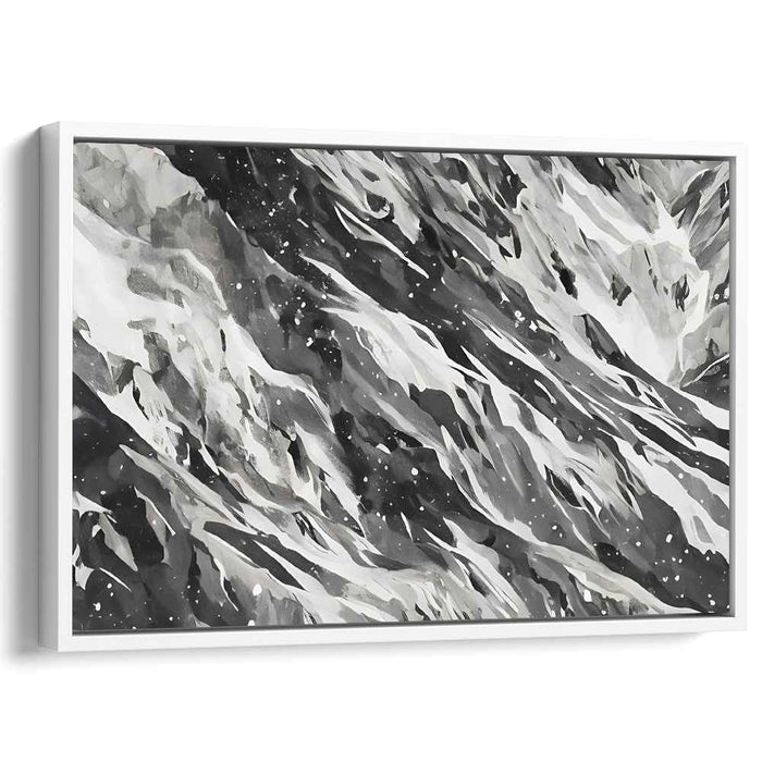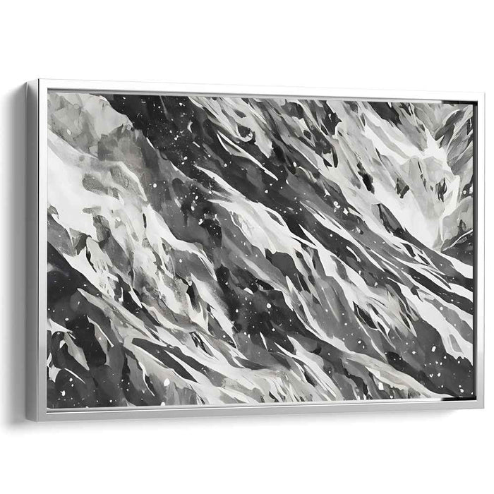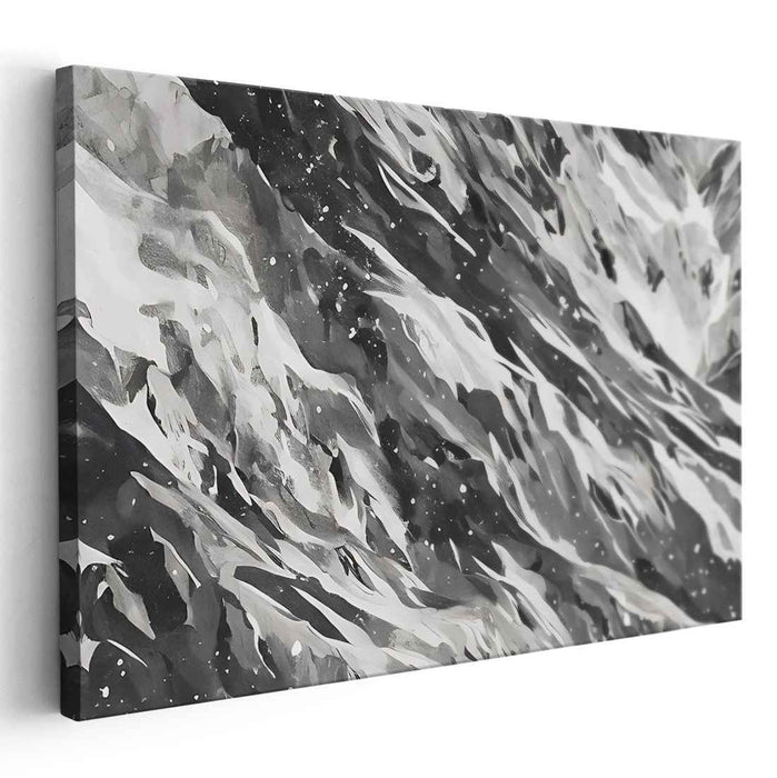 Introducing "Cascade Peaks," a striking abstract mountain landscape canvas art print that captures the dramatic and dynamic essence of mountainous terrain in a monochromatic palette of black, white, and varying shades of gray. This captivating artwork skillfully blends bold brush strokes and delicate splatters to convey a sense of movement, depth, and rugged majesty.