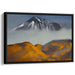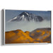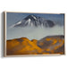 The focal point of this piece is the towering snow-capped mountain, its rugged grandeur softened by the gentle embrace of mist. In the foreground, a range of hills painted in warm earthy hues of orange and brown provides a striking contrast to the cool blues and whites of the distant peak, creating a harmonious balance that captivates the eye.