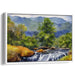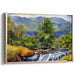 Introducing "Cascading Peaks Horizon: Serene Mountain River Landscape Canvas Art Print," a captivating masterpiece that immerses viewers in a tranquil and natural setting where a gentle river flows over rocks, surrounded by lush greenery and distant mountains. This realistic landscape painting is a meticulous portrayal of nature, bringing the scene to vibrant life with rich greens and blues dominating the palette, complemented by warm hues of rocks and foliage.