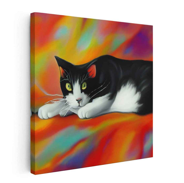 Introducing 'Catalyst Dream Dance: Whimsical Feline on Abstract Background,' a mesmerizing canvas art print that harmonizes the realms of reality and abstraction. This artwork showcases a meticulously detailed portrayal of a black and white cat, lounging elegantly against a backdrop alive with swirling hues of fiery oranges, radiant yellows, and deep purples. The cat's vivid green eyes and the intricate rendering of its fur stand out against the dynamic, almost ethereal quality of the abstract background.