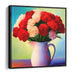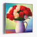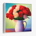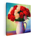 Introducing 'Ceramic Symphony,' a mesmerizing canvas art print that captures the timeless beauty of a vibrant bouquet of carnations elegantly displayed in a classic ceramic pitcher. This artwork is a jubilant symphony of color and form, harmonizing rich reds, delicate whites, and soft peaches against a backdrop of cool blues and gentle greens.