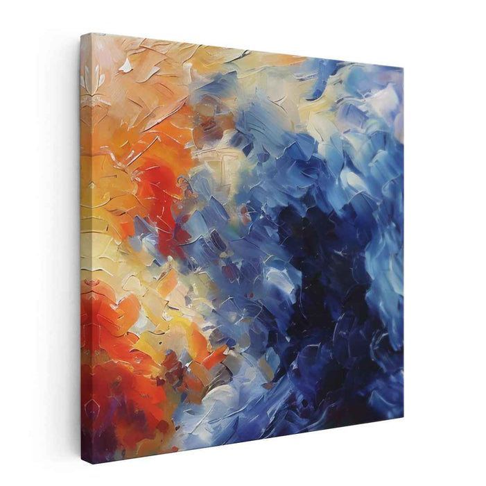 Introducing "Chaos Tamed by Fire: Abstract Expressionist Blue and Orange Canvas Art Print," a vibrant and captivating masterpiece that harmoniously blends bold colors and dynamic textures to create a visually striking abstract composition. This artwork is a symphony of deep blues and fiery oranges, expertly intertwined to evoke intense emotions and a sense of fluid motion, capturing the viewer's attention with its powerful presence.
