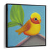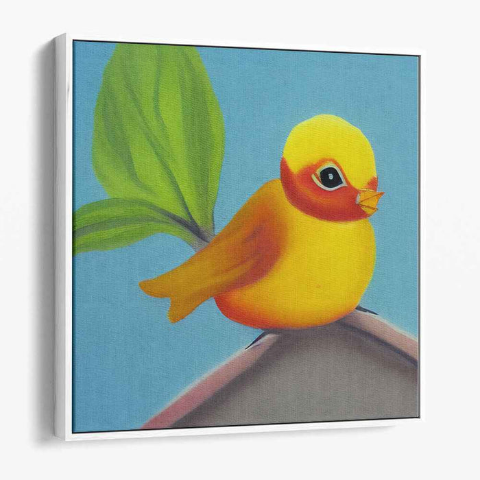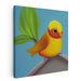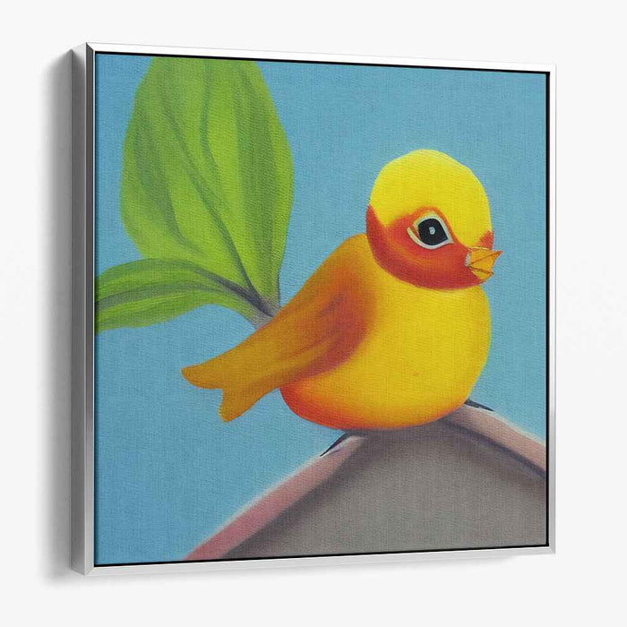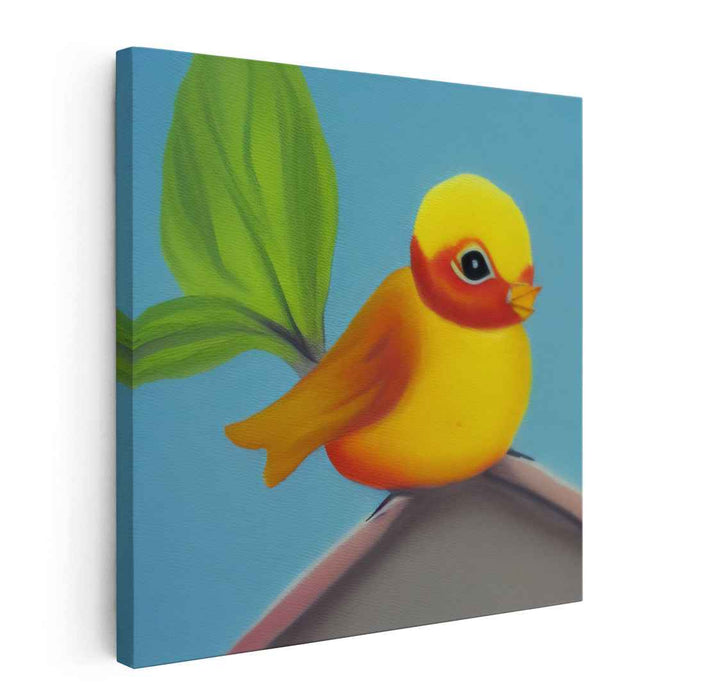 Introducing 'Cheerful Serenade,' a delightful canvas art print that captures the essence of joy and serenity through a charming portrayal of a small yellow bird perched gracefully on a branch. This captivating artwork seamlessly blends realism with stylization, presenting the bird in a velvety texture that accentuates its rounded forms and endearing features.