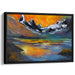 The foreground of the painting features a serene lake mirroring the vibrant tones of the setting sun, where warm shades of orange, yellow, and red seamlessly merge with the cool blues and greens of the water, creating a harmonious blend of colors. The artist's bold and expressive brushstrokes emphasize the dynamic and formidable aspects of nature, capturing the essence of raw power and tranquility in one frame.