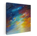 Immerse yourself in the swirling cosmic dance of 'Chromatic Luminescence Dance: A Vivid Abstract Exploration of Color and Light.' This captivating canvas art print draws the viewer into a universe of dynamic movements and vibrant hues. The artwork features a stunning spectrum of colors, transitioning smoothly from a deep, mysterious navy at the top to a warm, radiant burst of yellow and orange at the bottom. This gradient is interspersed with specks of white and pale blue, evoking the feeling of a star-studded night sky. The brushwork is bold and expressive, with thick, textured strokes that add depth and intensity to the visual experience. The use of color and form suggests a blend of abstract expressionism and impressionistic influences, reminiscent of the works of artists like Jackson Pollock and Claude Monet.