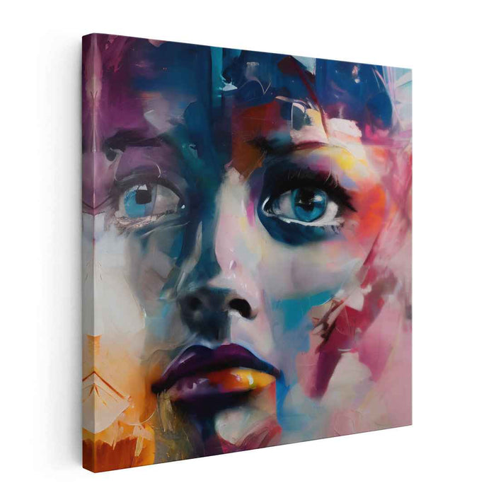 Introducing 'Chromatic Muse Mirage,' a mesmerizing canvas art print that captures the intense and emotionally expressive portrait of a woman in a bold and vibrant abstract style. This stunning artwork is a true explosion of colors, featuring deep blues, vivid pinks, and hints of yellows and whites, creating a visually striking and dynamic piece that demands attention.