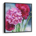 The artist's technique, characterized by fluidity and looseness, allows the colors to seamlessly merge, giving the impression of natural flow and organic development. Each petal of the carnations is meticulously detailed, with every brushstroke contributing to the intricate texture and lifelike depth of the flowers. The green stems and leaves contrast beautifully with the vibrant petals, providing a fresh and grounding element to the composition.
