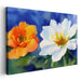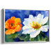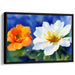 Introducing "Citrus Blossom Dance: Vibrant Orange and White Floral Watercolor Canvas Art Print," a captivating piece that celebrates the beauty of nature through the delicate rendering of two blooming flowers in a mesmerizing watercolor technique. This exquisite artwork features a striking contrast between a lively orange flower on the left and a pristine white flower on the right, set against a deep, rich blue background that enhances their vibrancy.