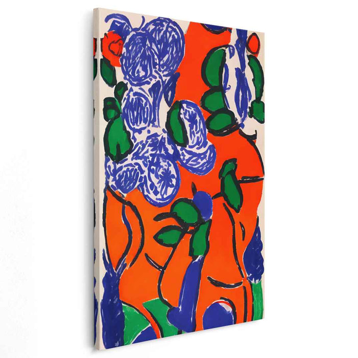 Introducing "Citrus Skies Spectrum: Vibrant Orange and Bold Blue," a captivating canvas art print that mesmerizes viewers with its explosion of color and abstract forms, exuding a sense of dynamic energy and vibrant creativity. The artwork's focal point is a vivid orange background that serves as a bold backdrop for swirling, organic shapes that playfully dance across the canvas in a harmonious yet chaotic display.